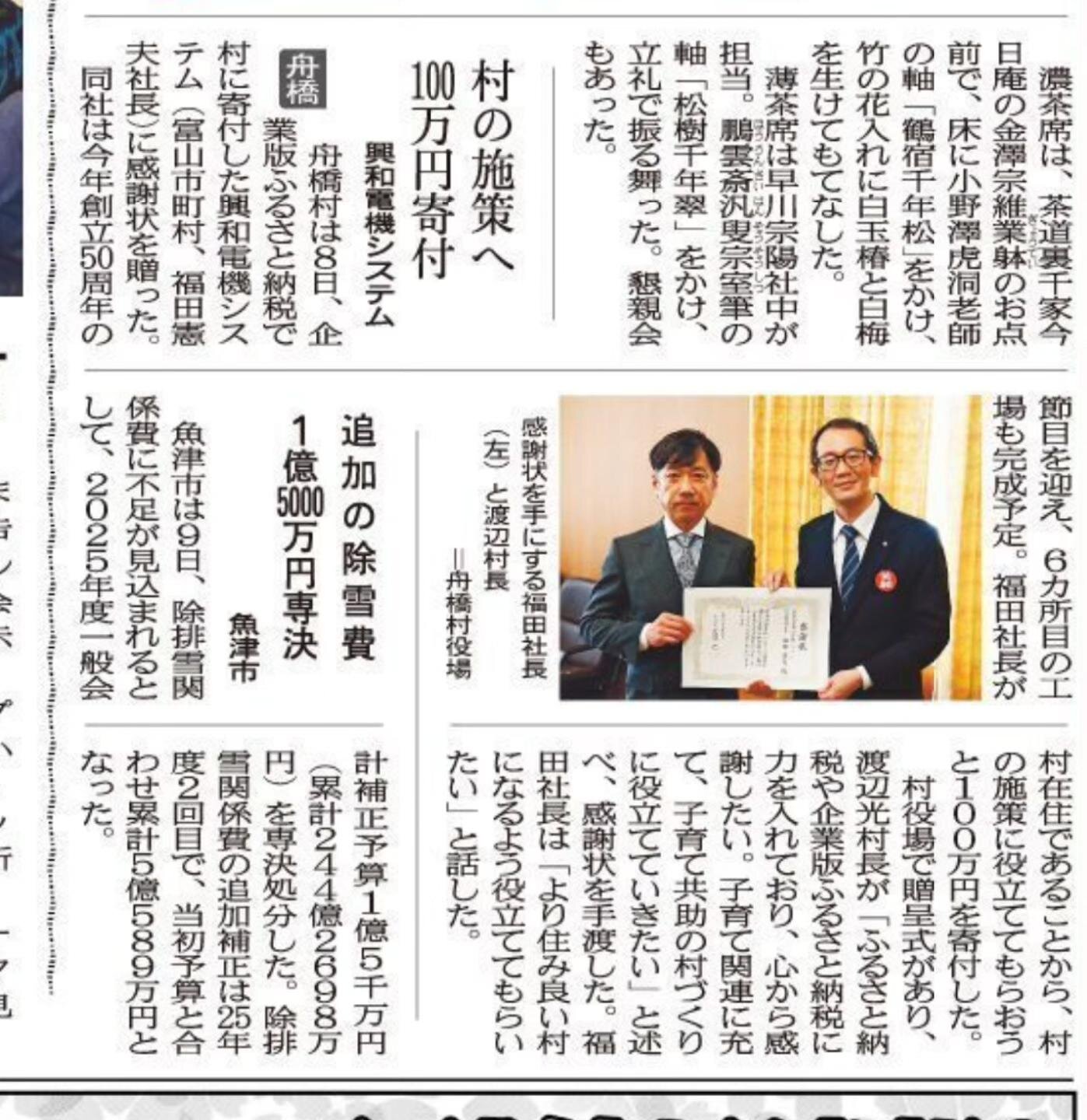 2月9日に興和電機システム(福田憲夫社長)より、企業版ふるさと納税制度を活用し、舟橋村へご寄付を頂戴いたしました。