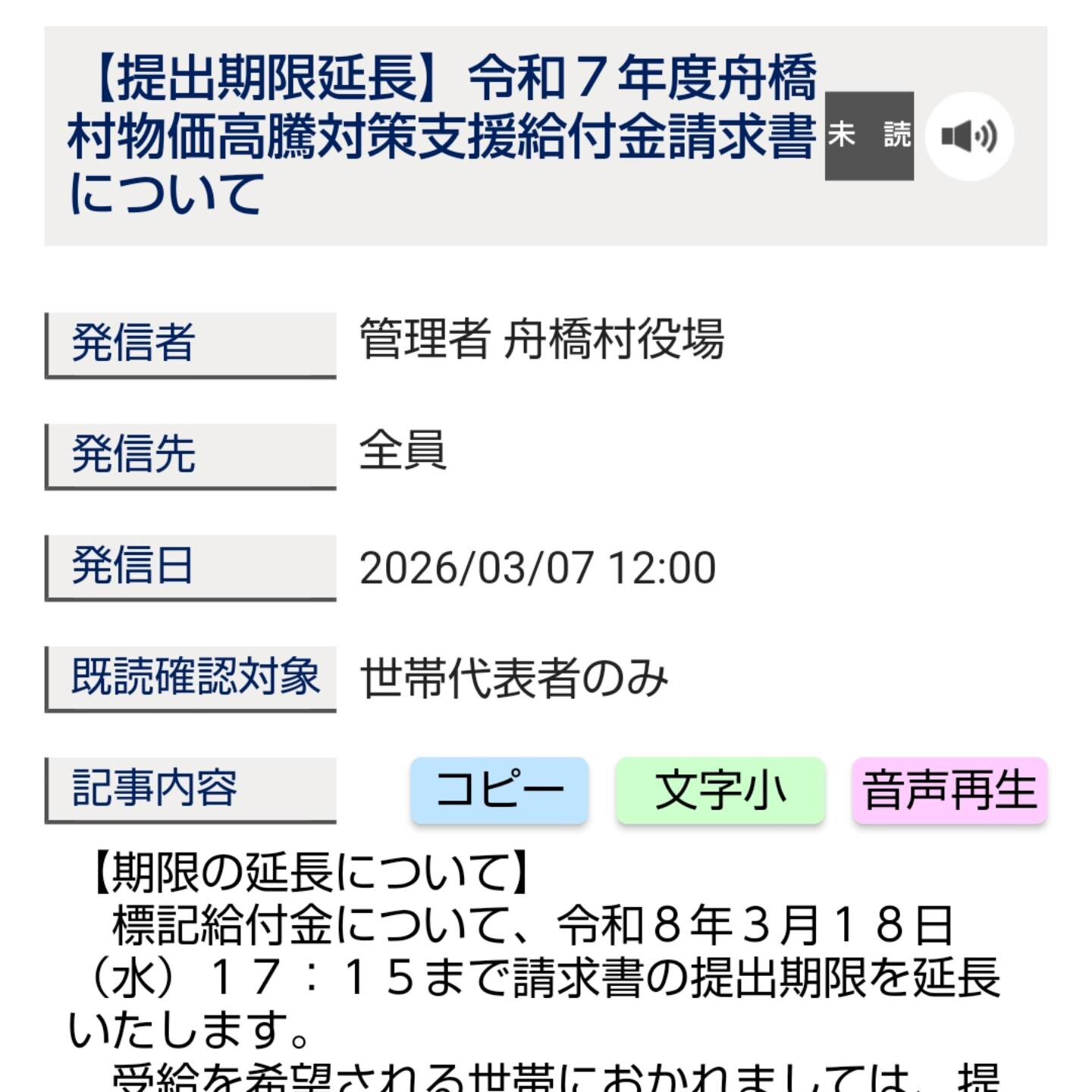 般橋村で実施させて頂いております舟橋村物価高騰対策支援給付金について、約200世帯の方からの申請がなされておりません。